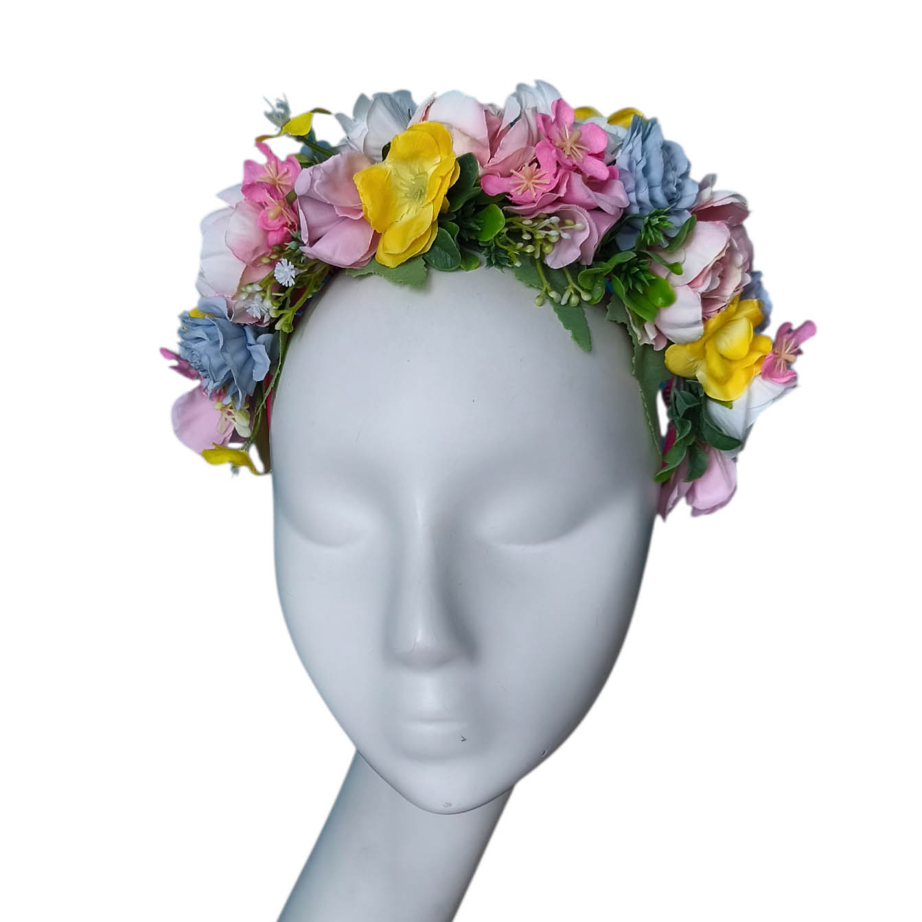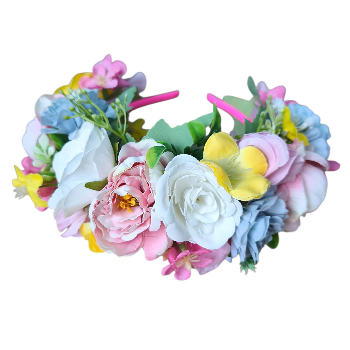 Opaska do włosów, rozmiar uniwersalny, dla starszych i młodszych panienek, wykonana z kwiatów materiałowych i sztucznych. Doskonala do komunii lub do sypania kwiatow.