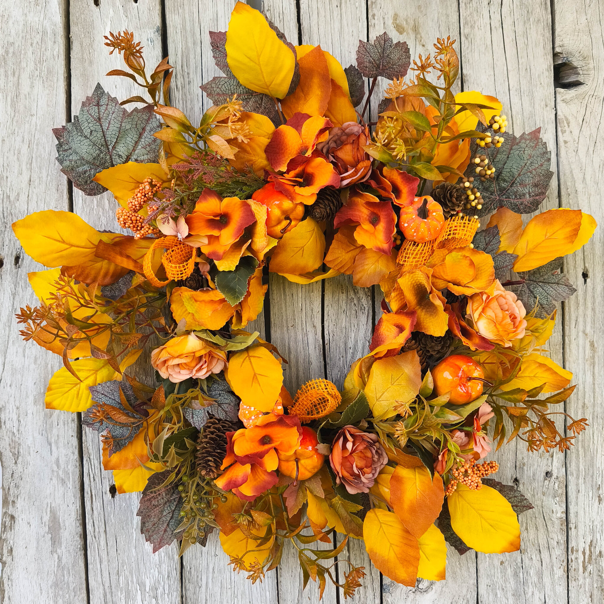 Wianek w ciepłych kolorach jesieni, wykonany ze sztucznych liści i kwiatów. Średnica ok. 48cm