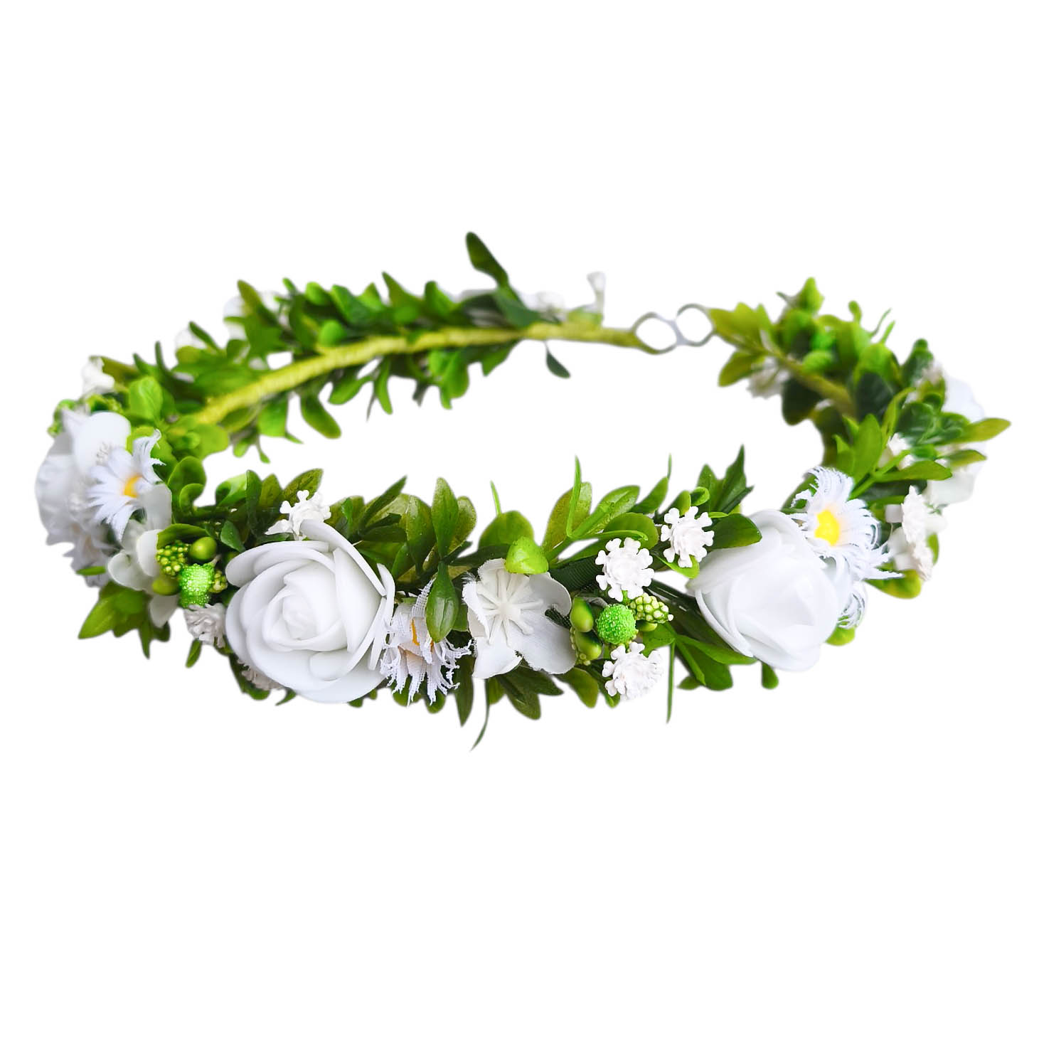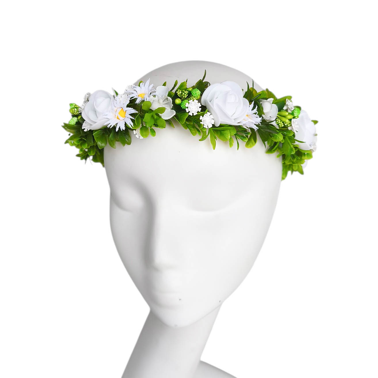 Wianek kwiatowy wykonany z najlepszych gatunkowo, bardzo naturalnie wyglądających zielonych gałązek i kwiatków róży i stokrotek. Do każdego wianka jest możliwość dorobienia ozdoby na rękę.